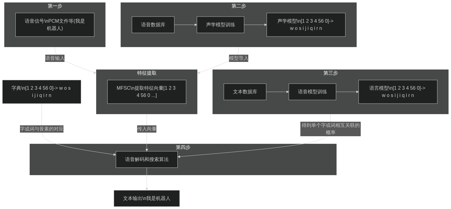 B-->|声学模型训练|05["声学模型:\n[1 2 3 4 56 0]-> w o s i j i q i r n"]-->C